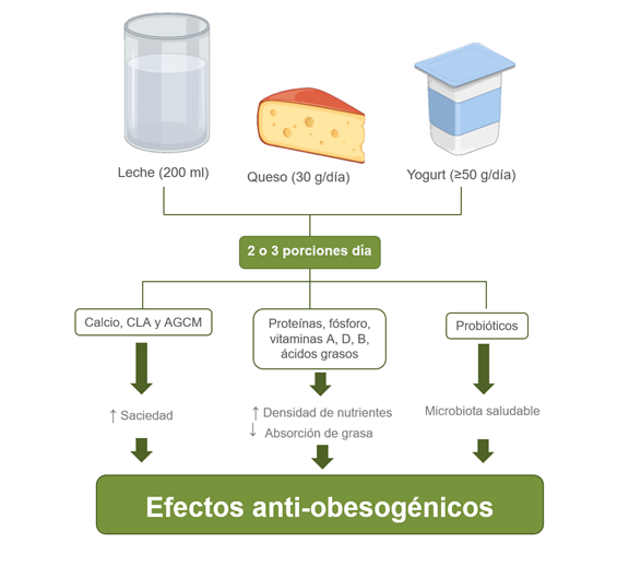 Para lograr comprender los efectos anti-obesogénicos generados por los lácteos, se han propuesto múltiples mecanismos asociados a sus nutrientes o compuestos bioactivos específicos. Destacan como los principales: el calcio y la proteína de suero, además del ácido linoleico conjugado (CLA), los ácidos grasos de cadena media (AGCM) y las modificaciones beneficiosas de la microbiota intestinal que ofrecen los probióticos lácteos (6). Por ejemplo, la interacción del calcio, CLA y AGCM presentes en los lácteos producen: i) menor absorción de lípidos en el intestino, ii) mayor lipolisis, beta-oxidación y termogénesis, iii) menor adipogénesis y lipogénesis, y iv) una menor ingesta de energía. Las proteínas del suero lácteo por su parte generan: i) conservación de la masa muscular y ii) mayor saciedad. Mientras que los probióticos lácteos al modificar positivamente la microbiota intestinal logran disminuir procesos lipogénicos que repercuten tanto en el intestino como en otros órganos tales como el hígado (3,5,6,7).